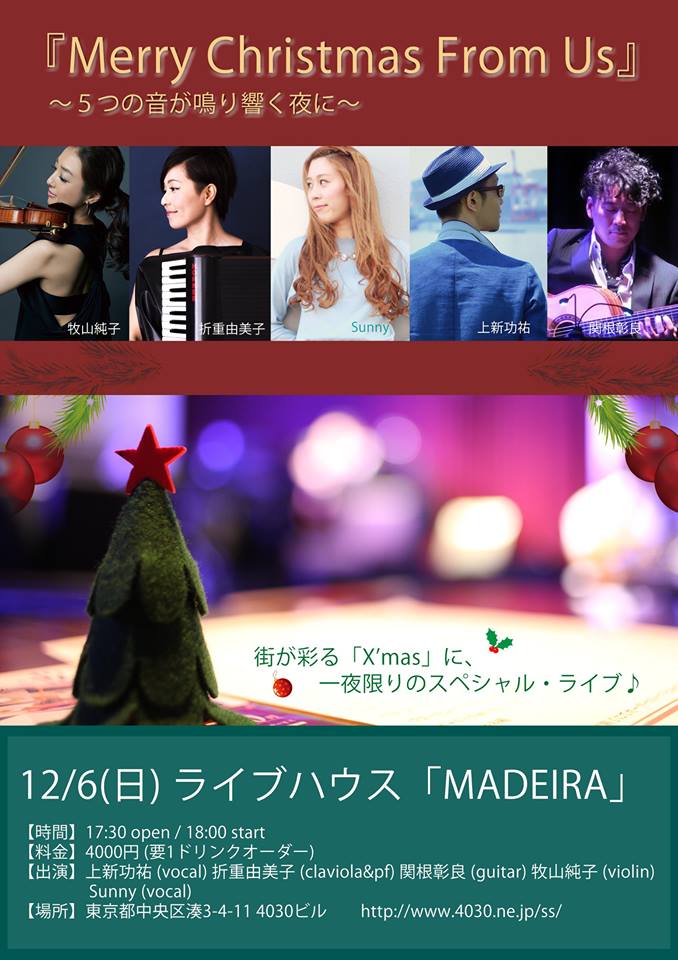 上新功祐(vo)、折重由美子(claviola&pf)、関根彰良(gt)、Sunny(vo)、牧山純子(vln)